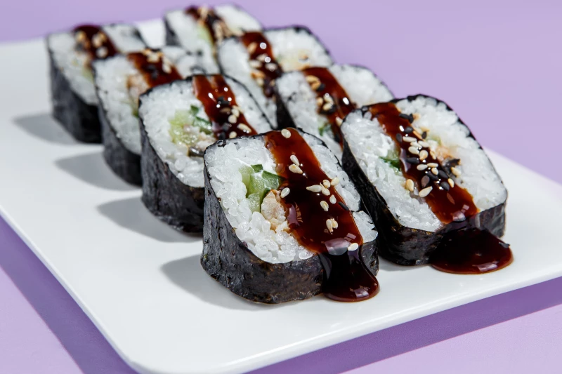 Ролл с угрем, сливочным сыром, огурцом и соусом унаги (8 шт.)