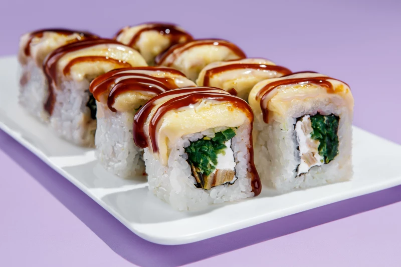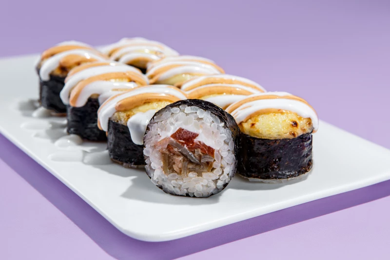 Запеченный ролл с угрем240 гЗапеченный ролл со сливочным сыром, угрем, огурцом, икрой масаго и соусом унаги (8 шт.)